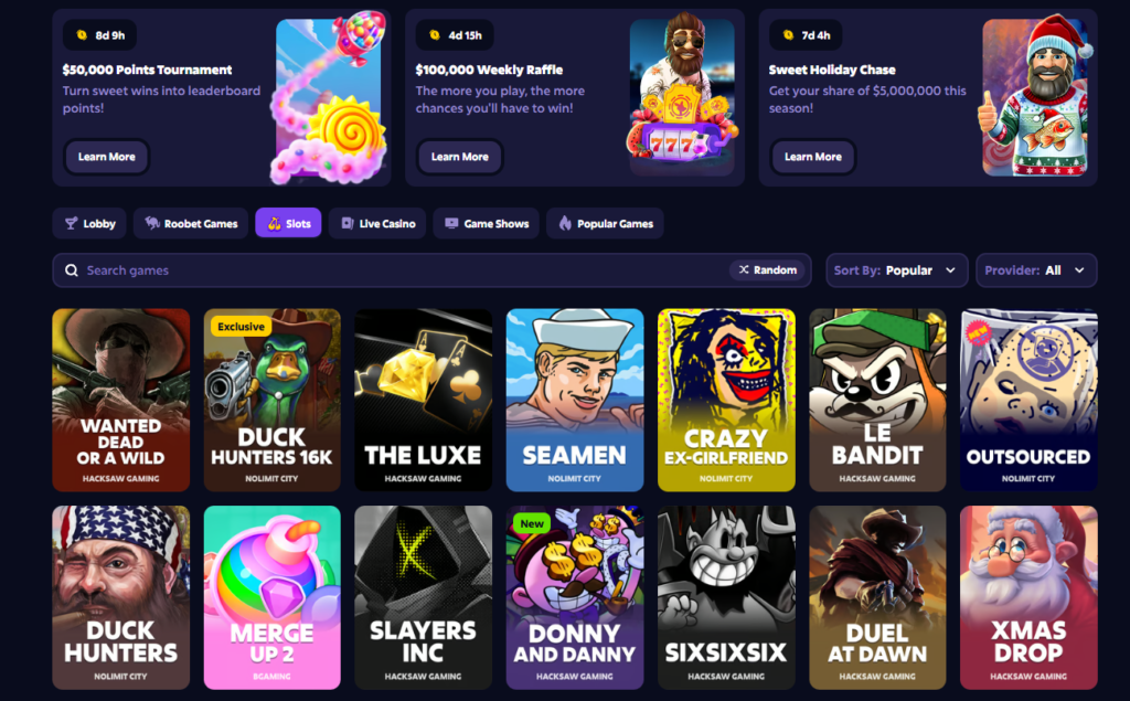 Roobet offers 3,000+ slot games from established providers like BGaming and Endorphina.